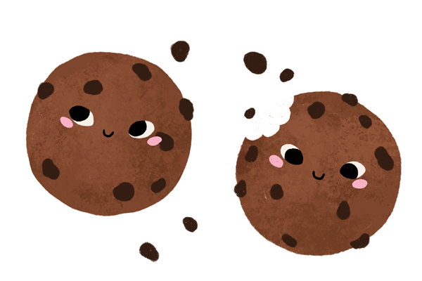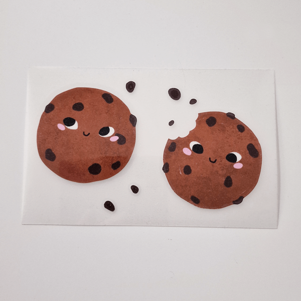 Cookies silityskuva-arkissa on kaksi suloista keksiä ja keksinmuruja. Voit halutessasi leikata kuvasta osia ja sommitella niitä itse vaatteisiin.