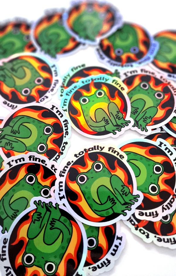 Tässä hauskassa tarrassa on hieman stressaantunut sammakko hokemassa itselleen, että kaikki on hyvin, todella hyvin!
