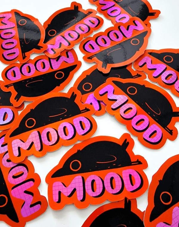 MOOD tarrassa pötköttelee hieman lamaantunut lintupolo punaisen oranssilla taustalla. Teksti on pinkki. Tarrassa on hologrammikuvio, joten tämä heijastelee sateenkaaren värejä valoa vasten.
