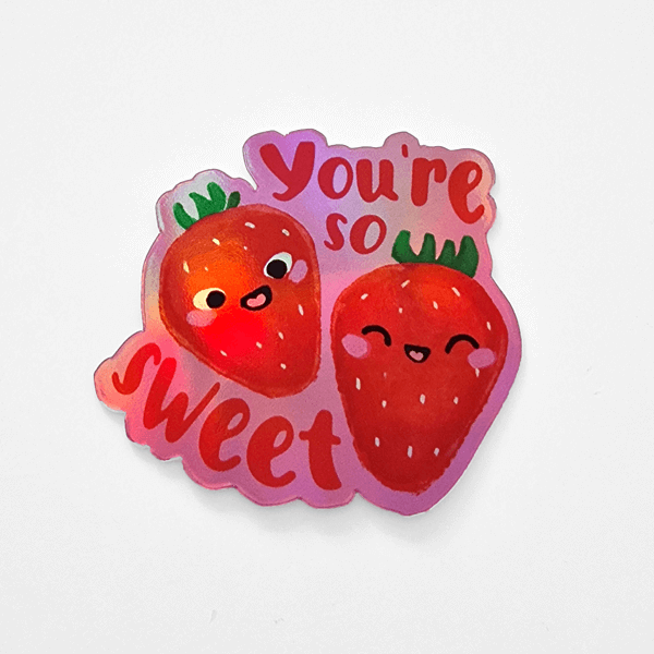 Tarrassa on suloiset mansikat pinkillä pohjalla, teskti punaisella.